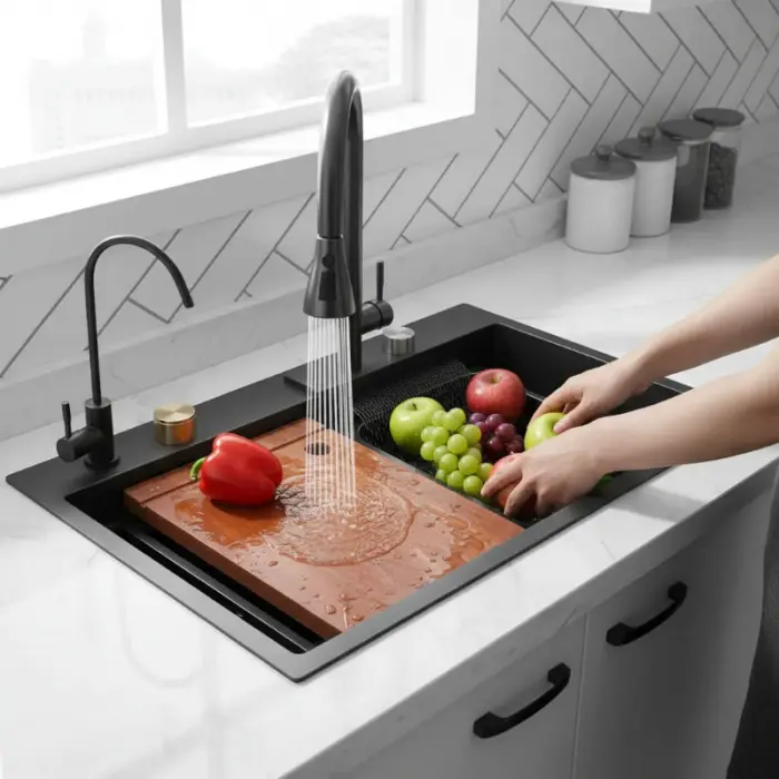 Bacha inteligenteAccesorios y conexión completaMedidas: 75 x 45 cmMaterial: Acero inoxidableColor nano black.
